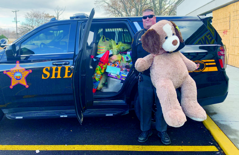 Columbiana County Sheriff’s Office Sgt. Brian Deack poses with a teddy bear next to a cruiser stuffed with toys at the Dollar General in Alliance, which is located in Columbiana County. The sheriff’s office is holding its annual holiday toy drive,with Heroes and Halos the chosen charity ...
