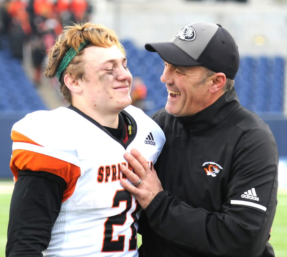 A father always knows what to say as Springfield coach Mark Brungard gets a smile from his son, starting quarterback Beau Brungard, following the Tigers’ 48-14 loss to top-ranked Anna in the Division VI state championship game Friday in Canton. See page B2 for more on the game.
