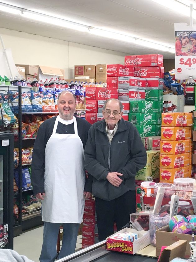 Submitted photo Eric Hull Jr. and his father, Eric Sr., stand in one of the checkout lanes at Hull’s Super Duper in New Garden. The grocery store recently celebrated its 50th year in business.