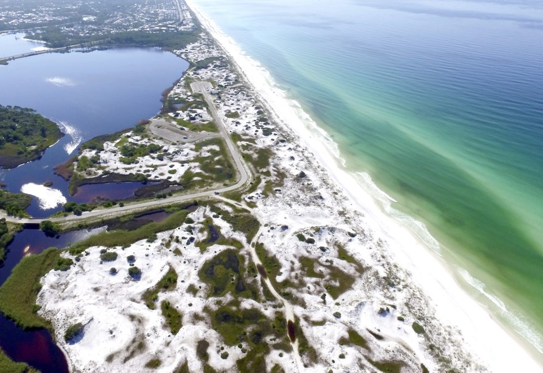 This Aug. 1, 2018, aerial photo made available by the Florida Department of Environmental Protection shows Grayton Beach State Park in Santa Rosa Beach, Fla. The beach earned the first spot of top U.S beaches according to Florida International University professor Stephen Leatherman. The beach was chosen in part because of its sugar-white sand and its clear, emerald-green water. (Running Man Pictures/Courtesy of Florida Department of Environmental Protection via AP)