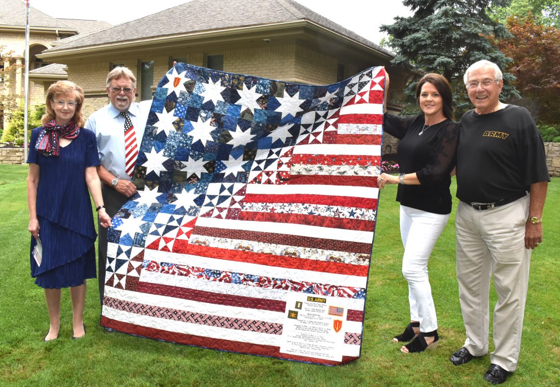Morning Journal/Mary Ann Greier From left, Salem residents Debbie and Steve Reed and Linda and Bob Sebo hold up the Quilt of Valor made by Steve's sister, Linda Rhoades, and presented to Bob as a thank you for his service in the U.S. Army. The two men became acquainted by phone after Steve learned a year ago that his home on West Pershing was Bob's boyhood home. His sister, who's very involved in the Quilts of Valor program, from her home in Texas, learned Bob served and decided to make the quilt.