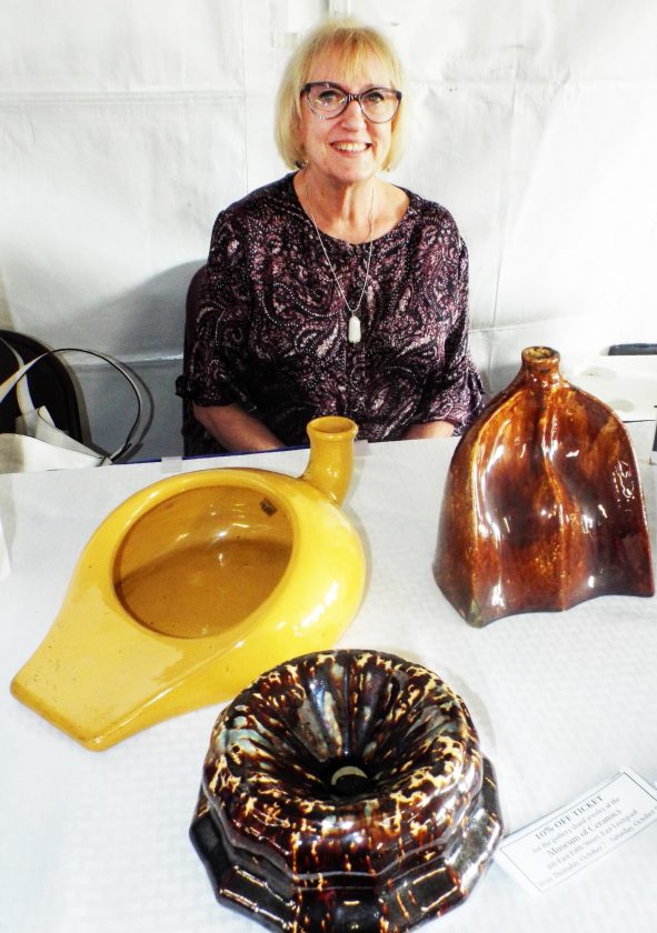 Morning Journal/Stephanie Ujhelyi Susan Weaver talked Friday morning to attendees about the history of ceramics from the Museum of Ceramics’ booth inside The Fiesta Tableware Company’s anniversary celebration. Can you guess what the items in front of her are? According to Weaver, they are (clockwise from left) a bed pan, a foot warmer and a spittoon.