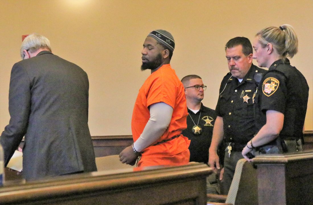 Morning Journal/Deanne Johnson Terrance Haywood speaks with his defense attorney Dennis McNamara before he left the courtroom with deputies Justin Madison, Jeff Haugh and Jennifer Calko after being sentenced on Wednesday.