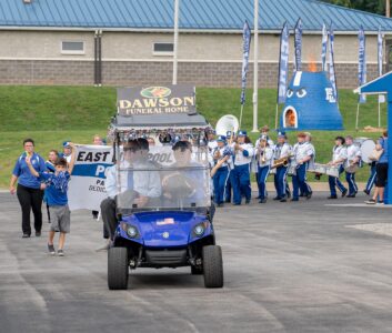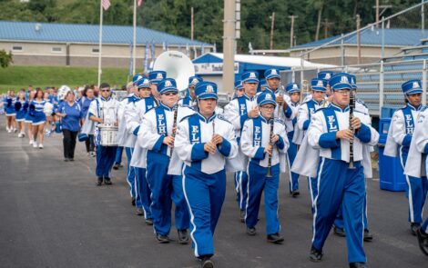 - ELHS Band ahead of ELHS Cheerleaders in the parade leading to the field.