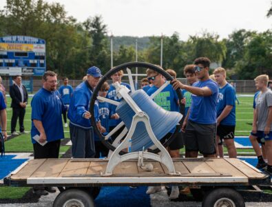 Ringing of the victory bell to officially dedicate the field (L-R) Jason Duke, Frank “Digger” Dawson, Gavin Wright, DaShawn Kirbyhand on the ball other football players in background