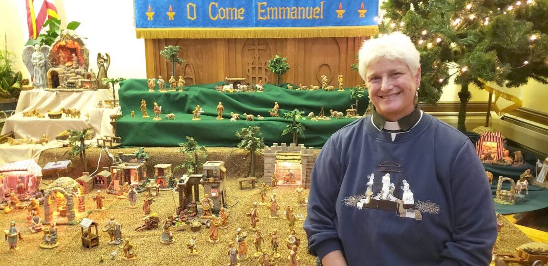 The December meeting of Delta Kappa Gamma Teachers Honorary was held at the St. Paul’s Lutheran Church in Leetonia. Pastor Kari Langford shared the history behind many of the more than 300 nativity scenes she has collected for over 34 years. Her sets range in interest for those who are 1 to 100 years old. The displays are available for public viewing by calling the church office at 330-427-6585 or 330-427-6592. Pictured, Pastor Kari Lankford with one area of her large nativity displays. Submitted photo