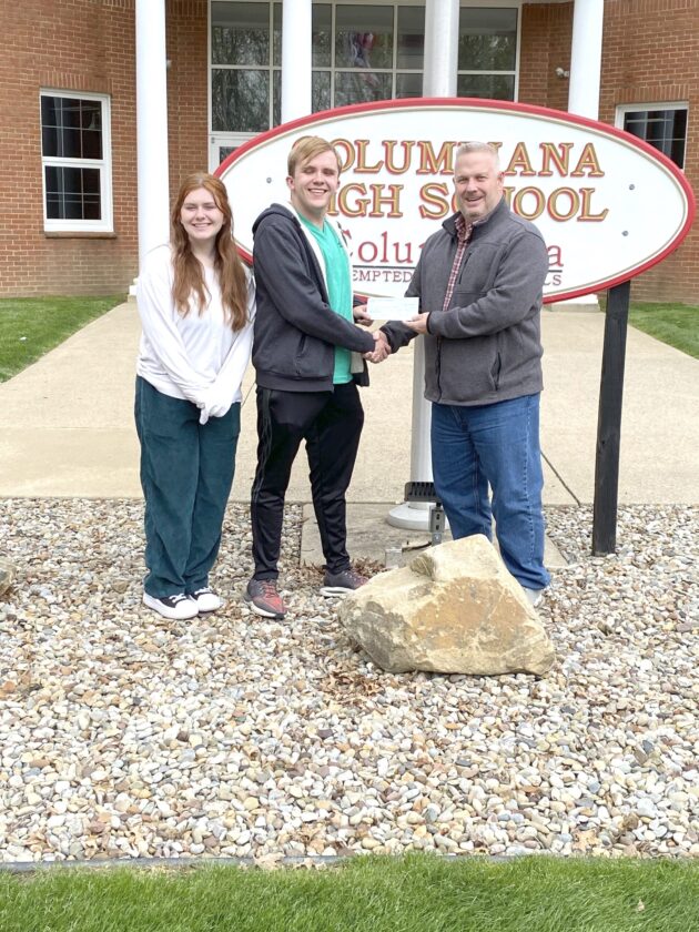 The Columbiana Community Foundation donated $2,626 to the Columbiana High School Quiz Bowl team to pay for expenses for them to compete in the National Championships in Chicago, Illinois, April 28-29. From left, team members Isabella Glover and Luke Mackall with foundation member Shane Patrone. Not pictured are team members John Rhodes and Jeremy Sanfrey. (Submitted photo)