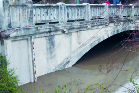 - Markings on the Wells Avenue Bridge indicate how high the river is and is used to monitor for flooding potential when the river is rising. (Photo by Kristi R. Garabrandt)