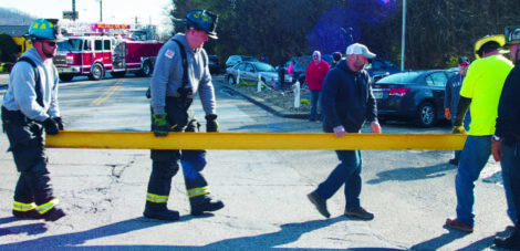 - Firefighters from multiple stations carry a support beam for the flood gate. (Photo by Kristi R. Garabrandt)