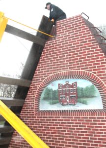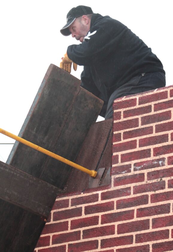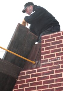 - Firefighter Mark Broughton, Wellsville Volunteer Fire Department, helps guide a plank into position on the flood gate. (Photo by Kristi R. Garabrandt)