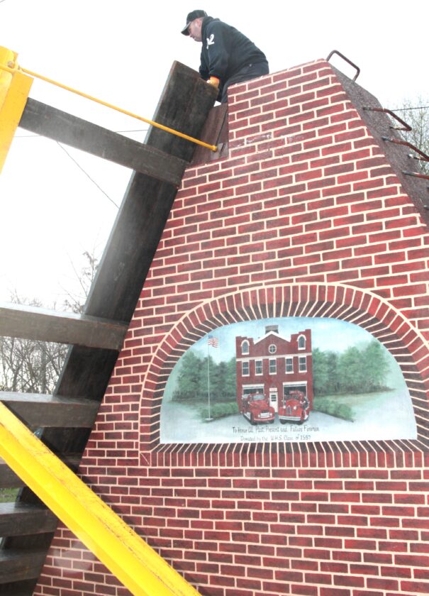 - Firefighters Mike Utt, Highlandtown Volunteer Fire Department, and Chad Elliot, Wellsville Volunteer Fire Department, guide a timer into place for the flood gate. (Photo by Kristi R. Garabrandt)