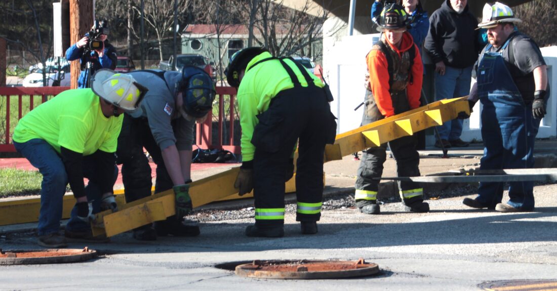 Firefighters work to remove the covers for the anchor points of the flood gate. (Photo by Kristi R. Garabrandt)