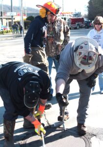- Firefighters from multiple stations work to anchor a support beam for the flood gate. (Photo by Kristi R. Garabrandt)