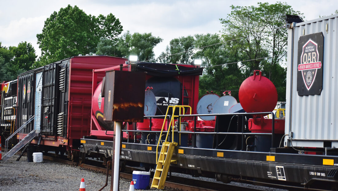 According to Norfolk Southern, the safety train includes a “dedicated locomotive, specially equipped classroom box cars, and several tanks cars for additional hands-on training along our lines.”