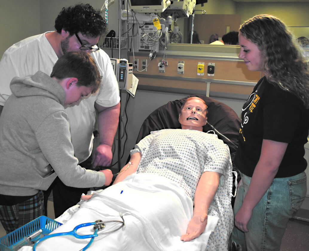 Ten-year-old Steele Watkins, an East Palestine fifth-grader, got hands-on training from College of Nursing students, junior Daniel Soletro and sophomore Haley Hazelbaker of Salem.