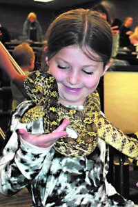 - Six-year-old Mae Aeschbacher made friends with Ferdinand, a ball python. She is a Crestview first-grader. (Photo by J.D. Creer)
