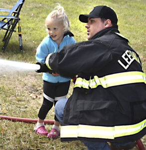 Brennon Kane of the Leetonia Fire Dept. gave children a thrill while demonstrating a fire hose. Shown here is 3-year-old Ruth Ludwig who attends Winona Methodist Preschool.