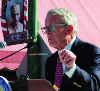 - Ohio Gov. Mike DeWine speaks to an audience on Fifth Street in downtown East Liverpool to announce the state’s investment of $1.2 million for the revitalization of downtown. (Photo by Kristi R. Garabrandt)