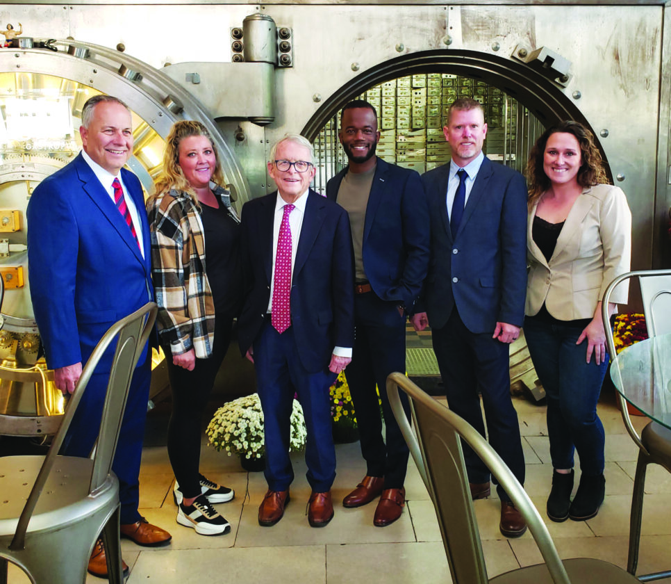 Ohio Gov. Mike DeWine (center) poses with, from left, Chuck Bailey, founder and president, True North LLC; Kiley May; Troy Chisom, Kevin Kerr and Mandy Jones, all management staff at Cadence Vault and Gastro Pub, during his visit and walking tour of downtown East Liverpool. (Photo by Kristi R. Garabrandt)