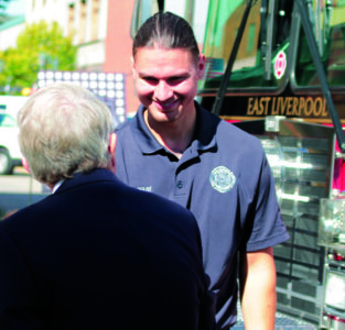 - Ohio Gov. Mike DeWine stops to talk to East Liverpool Firefighter/Paramedic Michael DuBray during a walk through downtown when he visited East Liverpool on Wednesday. (Photo by Kristi R. Garabrandt)