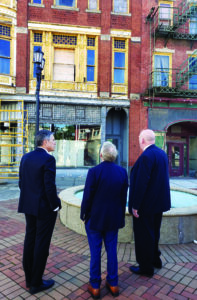 - Developer Craig Cozza, Ohio Gov. Mike DeWine and Thompson Building Project Architect Scott Shepherd look at the Thompson Building during DeWine’s visit to East Liverpool to announce a $1.2 million investment for building renovations. (Photo by Kristi R. Garabrandt)