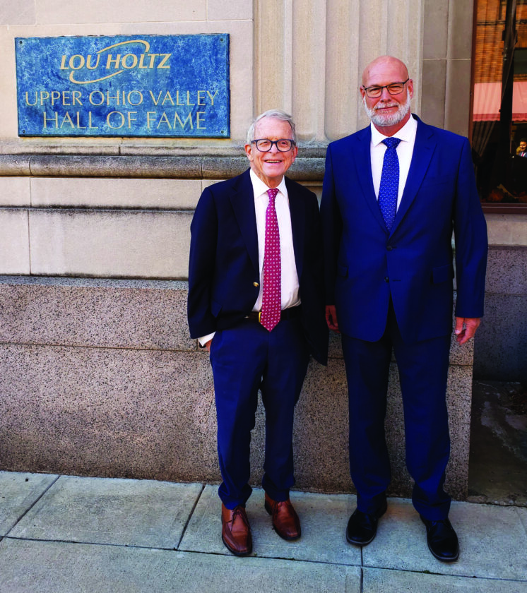 - Ohio Gov. Mike DeWine stops during his walk about downtown East Liverpool for a photo with Mayor Bobby Smith. (Photo by Kristi R. Garabrandt)