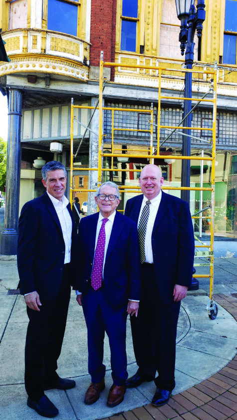 - Developer Craig Cozza, Ohio Gov. Mike DeWine and Thompson Building Project Architect Scott Shepherd stand in front of the Thompson Building for which DeWine announced funding for renovations. (Photo by Kristi R. Garabrandt)