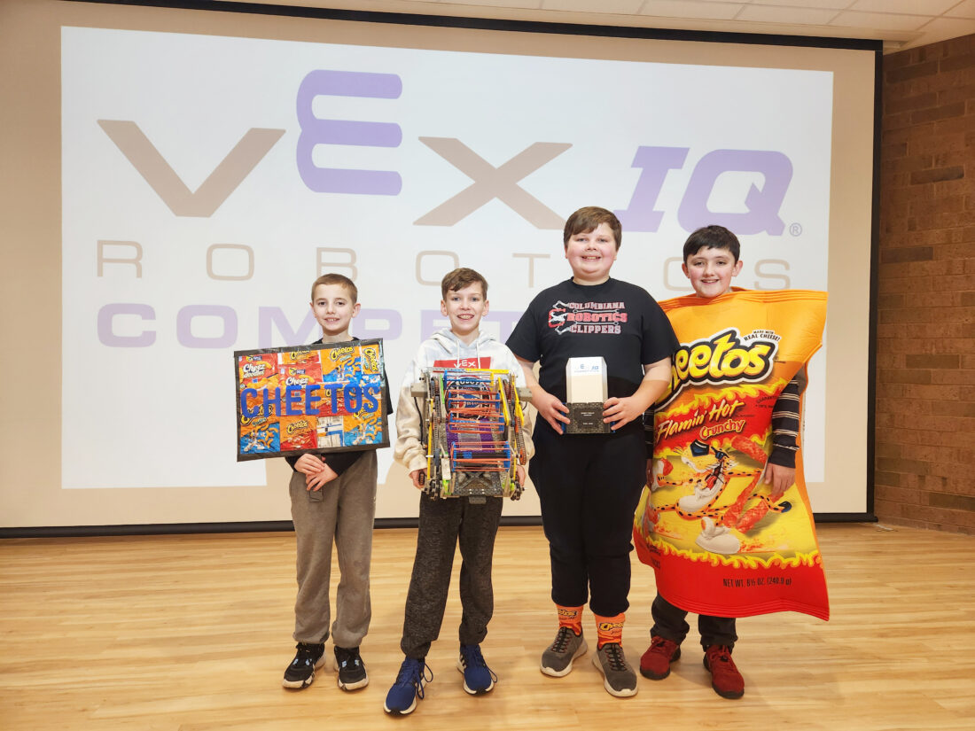 - “The Almighty Cheeto Puffs” solidified its state championship berth by taking home the most prestigious “Excellence” award, along with the Robot Skills Champion trophy. Pictured from left are team members Parker Clark, James Conrad, Colton Burns and Sammy Harberson. They are all sixth-grade students at Columbiana Middle School.