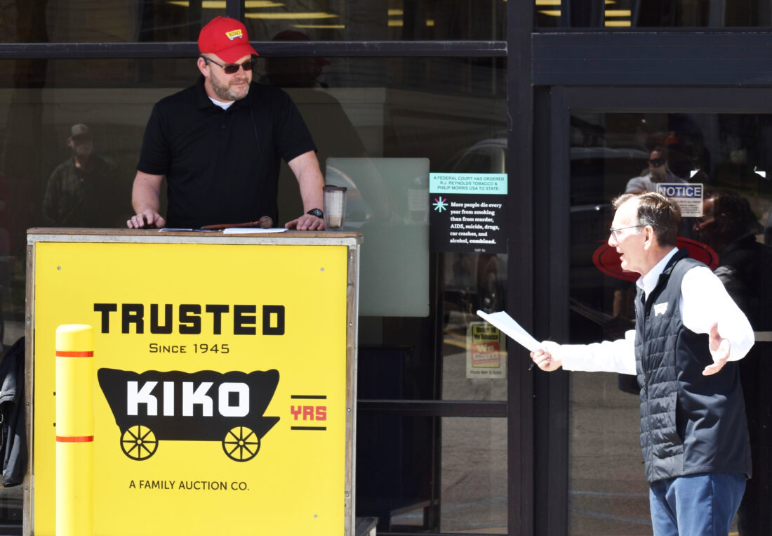 Auctioneer Matthew Kiko looks at Russell Kiko as what became the winning bid to purchase the former Sparkle Market building in Salem was submitted during an on-site auction at 423 Lundy Ave. on Tuesday. That bid of $410,000 came from John Buta of Butech Bliss. (Photo by Stephanie Elverd)