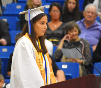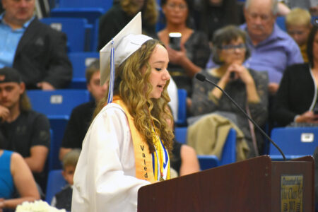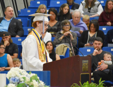 Isabella Cornwell, co-valedictorian, delivers her speech during Lisbon’s 155th commencement ceremonies held Sunday inside the George M. Nace Gymnasium. (Photo by Stephanie Elverd)