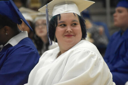 - : Marshall Hall, co-valedictorian and class president, smiles as he takes his seat after delivering his speech during Lisbon’s 155th commencement ceremonies held Sunday inside the George M. Nace Gymnasium. (Photo by Stephanie Elverd)