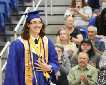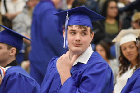 : Marshall Hall, co-valedictorian and class president, smiles as he takes his seat after delivering his speech during Lisbon’s 155th commencement ceremonies held Sunday inside the George M. Nace Gymnasium. (Photo by Stephanie Elverd)