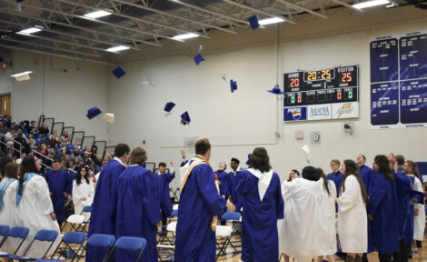 Caps fall to the ground at the end of David Anderson High School’s Class of 2025 turn of tassels during the 155th commencement ceremony Sunday afternoon at the George M. Nace Gymnasium. (Photo by Stephanie Elverd)