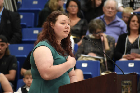 Kaitlyn Gushert, co-valedictorian, delivers her speech during Lisbon’s 155th commencement ceremonies held Sunday inside the George M. Nace Gymnasium. (Photo by Stephanie Elverd)