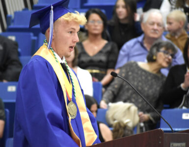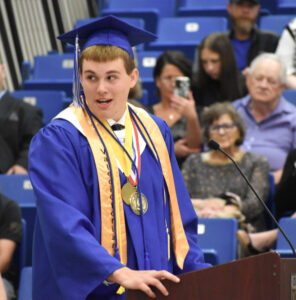 - Salutatorian Timothy Brandon kicks off the student speeches during Lisbon’s 155th commencement ceremony Sunday afternoon at the George M. Nace Gymnasium. (Photo by Stephanie Elverd)
