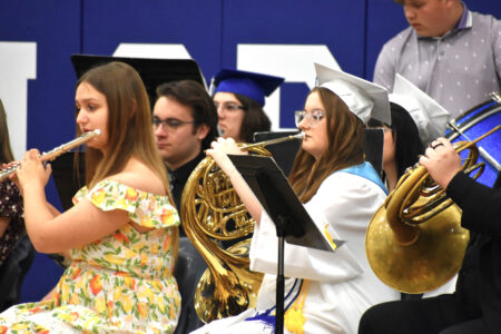 The 2025 David Anderson High School graduates join the band one last time during the 155th commencement ceremony Sunday afternoon at the George M. Nace Gymnasium. (Photo by Stephanie Elverd)