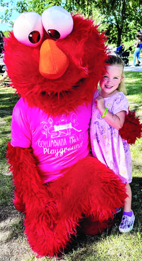 Elmo, Sesame Street’s favorite red muppet, donned a most comfortable pink Columbiana Project Playground T-shirt to the inaugural Family Fun Day, where he made many friends including 5-year-old Addi Kale, shown here. (Submitted photo)