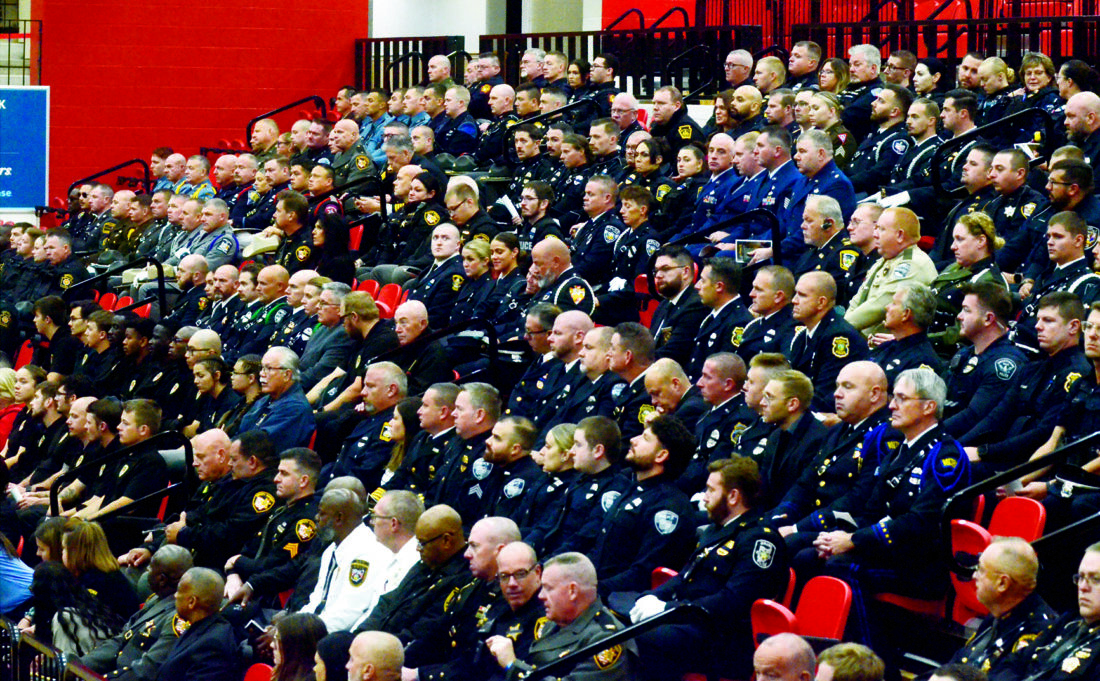 Seeing that many officers — most in black uniforms — inside the Zidian Family Arena at YSU was impressive enough. But when they stood silently and reverently in multiple rows on both sides of the route as 200 bagpipers played “Amazing Grace,” the scene took on epic proportions.