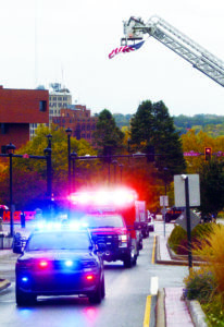 - 102225…R OSP SERVICE 7…Youngstown…10-22-25…As a strong wind blows the procession for OSP Trooper Nicholas P. Cayton travels under and American flag along 5th Ave. in downtown Youngstown following the service…by R. Michael Semple