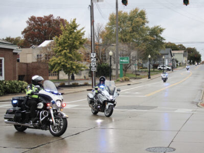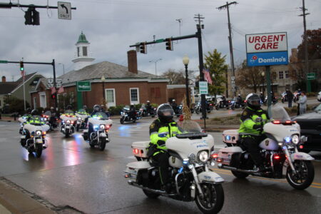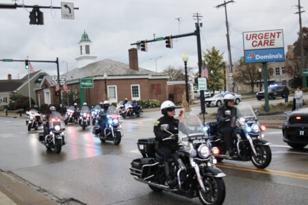 Following a public celebration of life ceremony held at Youngstown State University’s Beeghly Center Wednesday a funeral procession of first responders from across the Mahoning Valley and beyond escorted the late Trooper Nicholas Cayton, 40, from the Beeghly Center to Arbaugh Pearce Greenisen Funeral Home in Salem. (Photo by Morgan Ahart)
