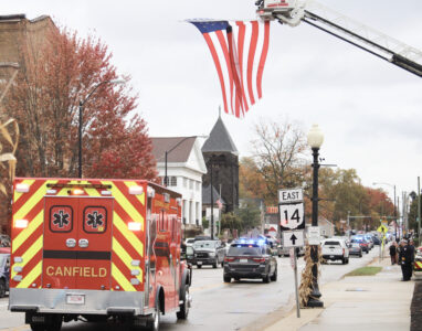 - Following a public celebration of life ceremony held at Youngstown State University’s Beeghly Center Wednesday a funeral procession of first responders from across the Mahoning Valley and beyond escorted the late Trooper Nicholas Cayton, 40, from the Beeghly Center to Arbaugh Pearce Greenisen Funeral Home in Salem. (Photo by Morgan Ahart)