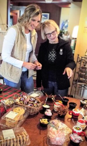Zach King from Columbiana’s Tourism Bureau is flanked by his daughters Evelyn, 7, and Ella, 6, as they work on doing the introductory frosting on their gingerbread houses. Bottom, State Rep. Monica Robb Blasdel and her aunt Barb Mercer browse a table filled with embellishments for gingerbread houses at Willows by Wehr.