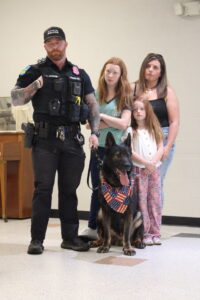 - K-9 Noras sits with his handler Officer Joshua Jackson, Officer Joshua Jackson, Jackson’s wife Ashley and daughters Olivia (16) and Ava (6), while his retirement is announced and approved. (Photo by Kristi R. Garabrandt)