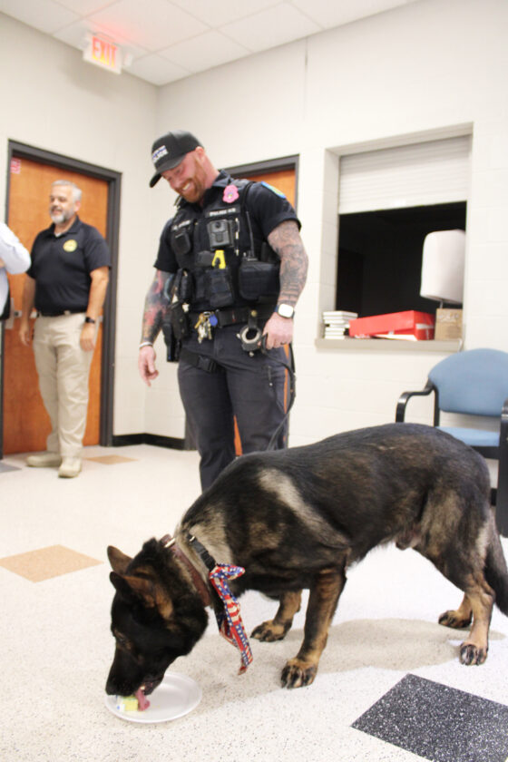 Following the approval of his retirement, those in attendance gathered to pet K-9 Noras. A slice of cake was given to K-9 Noras to celebrate his retirement. K-9 Noras, who doesn’t often have sweets, devoured the slice of cake given to him.