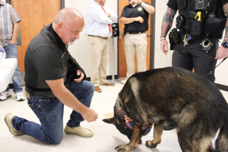 K-9 Noras sits with his handler Officer Joshua Jackson, Officer Joshua Jackson, Jackson’s wife Ashley and daughters Olivia (16) and Ava (6), while his retirement is announced and approved. (Photo by Kristi R. Garabrandt)