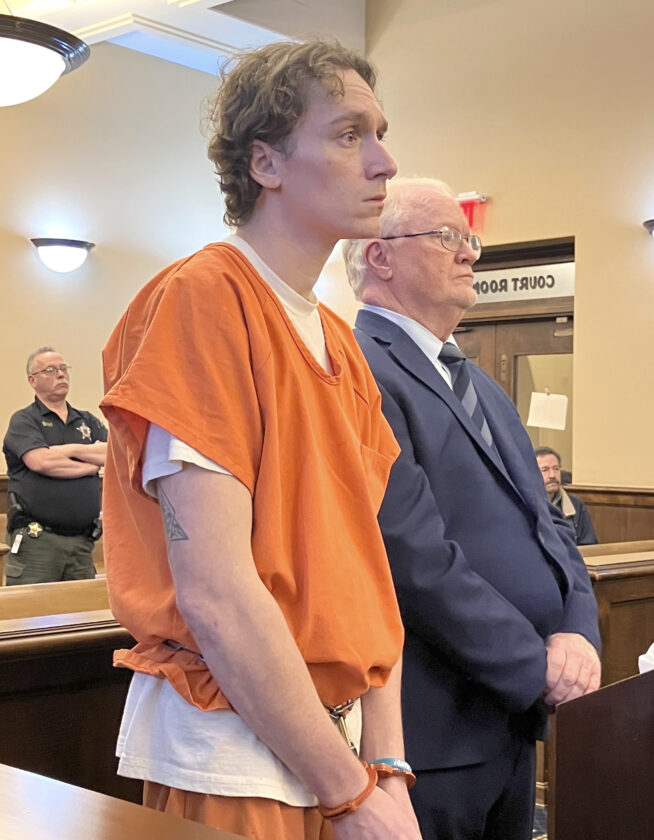 Nathan A. Johnson stands with his defense attorney Jeff Jakmides during his plea and sentencing Friday for assaulting a man and breaking into two homes in New Waterford in July, including the home of a state representative and judge. He was sentenced to a minimum seven years in prison, with a maximum possible of 10 1/2 years. (Photo by Mary Ann Greier)