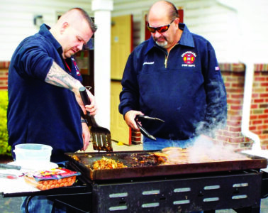 - Columbiana firefighters Dan Baumgardner and Chris Costanza man the grill as they cook hot dogs and sausage sandwiches. (Photo by Stephanie Ujhelyi)