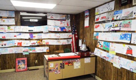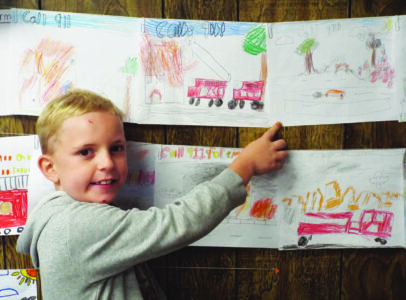 - Beckett Rutt, 8, points at his drawing on display. He was in attendance at the event with his grandmother and cousins who were visiting from Columbus. (Photo by Stephanie Ujhelyi)