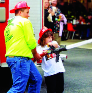 - Volunteer Declan Radcliff assists 6-year-old Jemma Welsh direct a fire hose to knock down flames in a game. She was attending the event with her parents, sister and dog all of Columbiana.(Photo by Stephanie Ujhelyi)