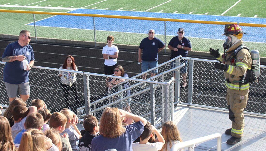 Fire Chief Jeremiah Cole was joined by Assistant Chief B.J. Davis, firefighters Cody Rose, Andrew Russell and Michelle Cole and junior firefighter and Southern Local High School student Chase Utt for the presentation at Wigwam Stadium. Cole discussed how best to respond should a house fire occur and queried a group of third-graders on their knowledge.